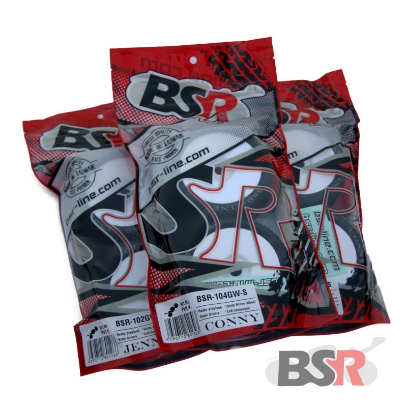 Die Lieferung der BSR-Line Reifen erfolgt immer Paarweise in einer wiederverschließbaren Zip-Tüte, als fertig verklebtes Komplettrad mit weißen 84mm Diskfelgen mit passgenauer 17mm Sechskant-Felgenaufnahme.
