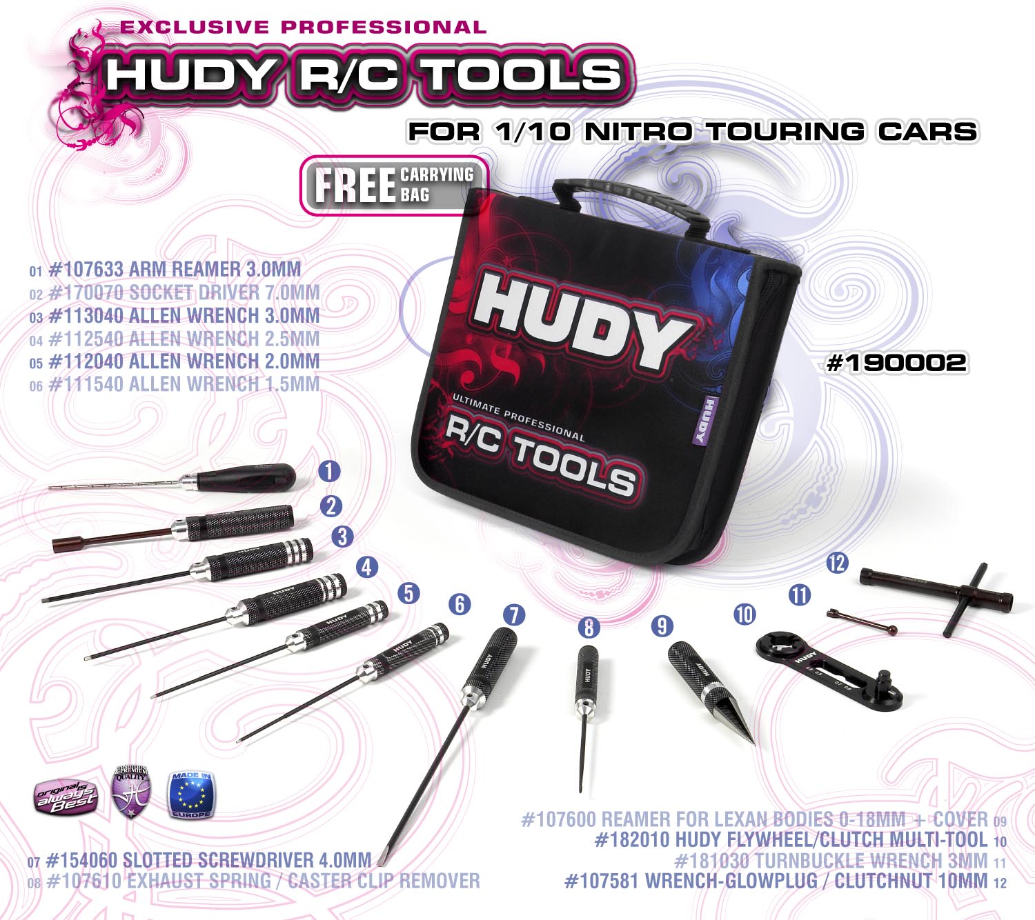 Complete HUDY Ultimate Professional R/C Tool Set features all necessary hand tools for nitro touring cars, along with a premium-quality exclusive tool bag with a super-modern look with cool, stylish and full-color graphics around the bag. High-quality European materials and craftsmanship are in abundance. Ideal size for carrying your RC tools and accessories; holds up to 30 tools.