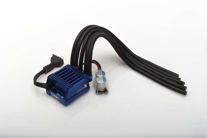 Abgerundet mit schwarzen 12AWG Powerkabeln, einem kurzen Empfängerkabel sowie einem beeindruckenden neuen Gehäuse und Tastern komplett aus dunkelblauem Aluminium sticht der Flow X aus der Masse heraus und passt in jedes Tourenwagen-Chassis.