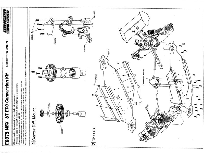 Nicht zum Lieferumfang des Kits gehören Karosserie, Reifen, Antriebsmotor, Akku und Fahrtregler. Er dient lediglich zum Umrüsten eines bereits vorhandenen oder separat zu erwerbenden Mugen Seiki MBX-6T in der Nitroversion.