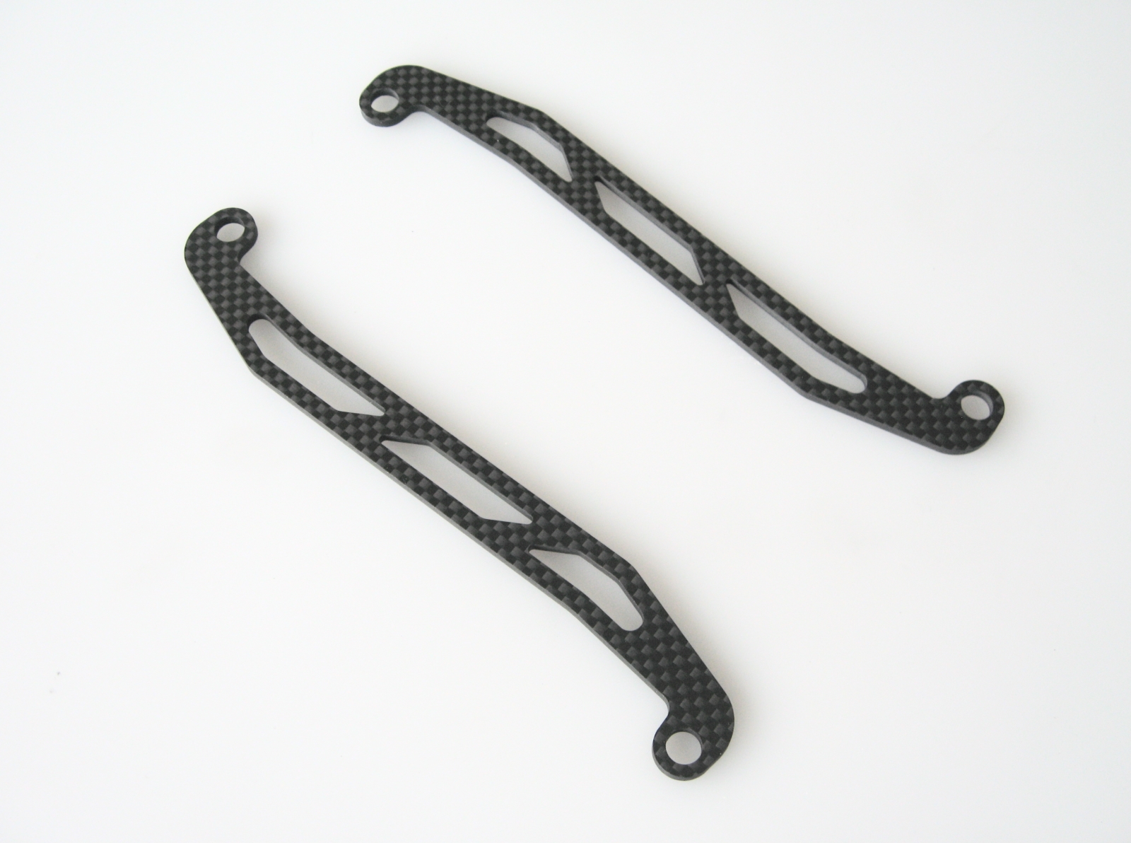 The set includes a nicely machined aluminum servo holder, a carbon fibre speedo mount plate, a carbon fibre diff-cover with alu top-spacer, and 2 x 2.25mm carbon fibre battery-braces, which allow the use of slightly thicker Lipo packs too. The alu antenna mount tops it off.