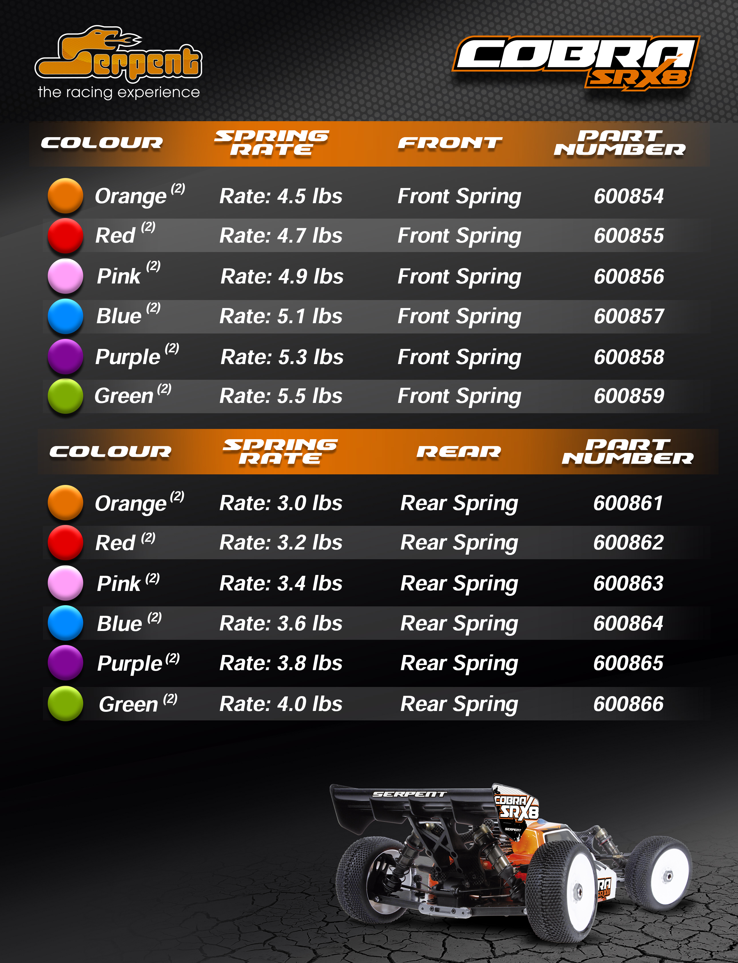 Shockspring set RR (6x2) Shockspring RR orange 3.0lbs (2) Shockspring RR red 3.2lbs (2) Shockspring RR pink 3.4lbs (2) Shockspring RR blue 3.6lbs (2) Shockspring RR purple 3.8lbs (2) Shockspring RR green 4.0lbs (2)