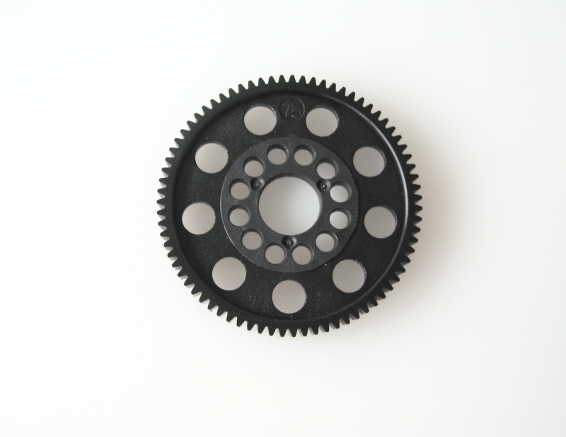 Spur-gear 48P /75T Super true running, durable nylon, light, 12 small holes and 9 large holes to reach motormounts easier. The number of tooth is on the gears for easy find. Fits most electric cars.