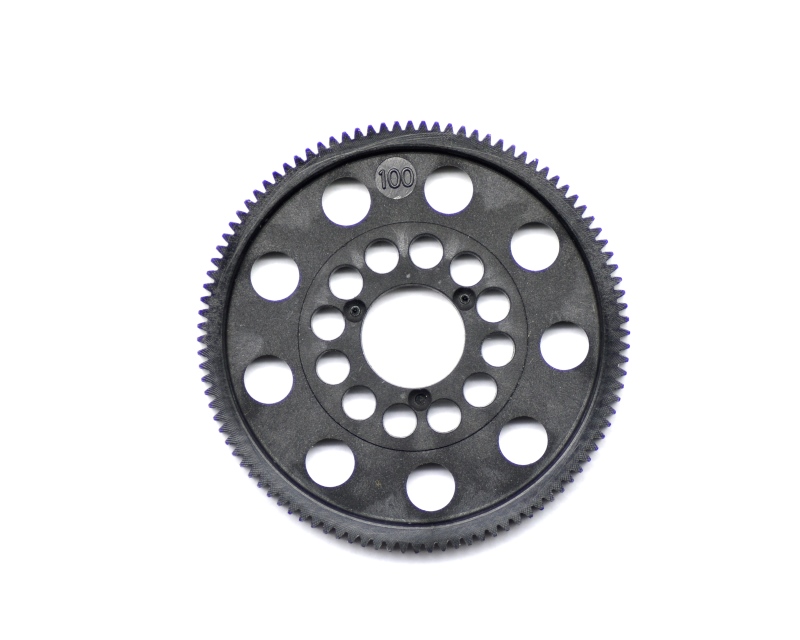 Spur-gear Super-True 64P / 100T Super true running, durable nylon, light, 12 small holes and 9 large holes to reach motormounts easier. The number of tooth is on the gears for easy find. Fits most electric cars.