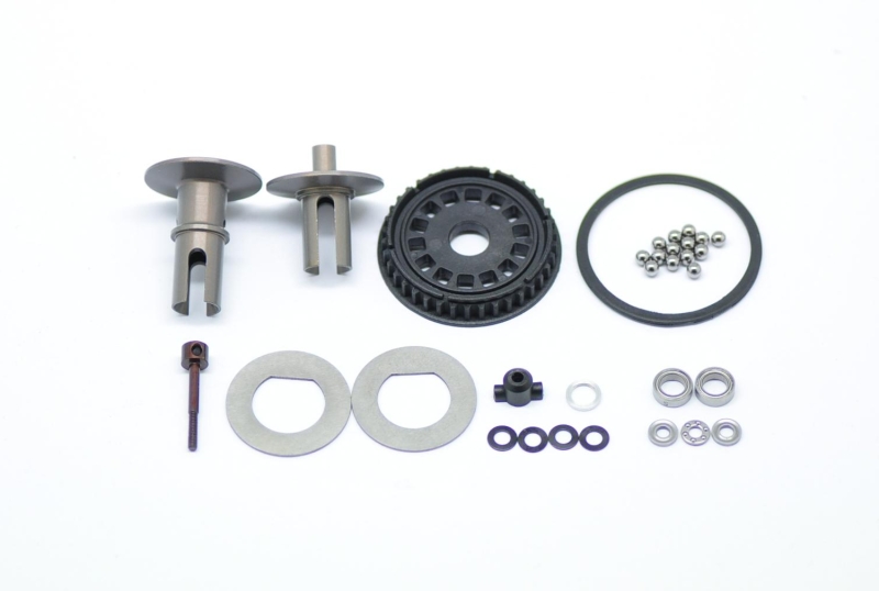Ball-differential set for the 411. Hard anodized aerospace aluminium diff shafts, precision made diff pulley with 14 balls for supersmooth action. Smart diff-nut, high speed bearings and tough thurst bearing.