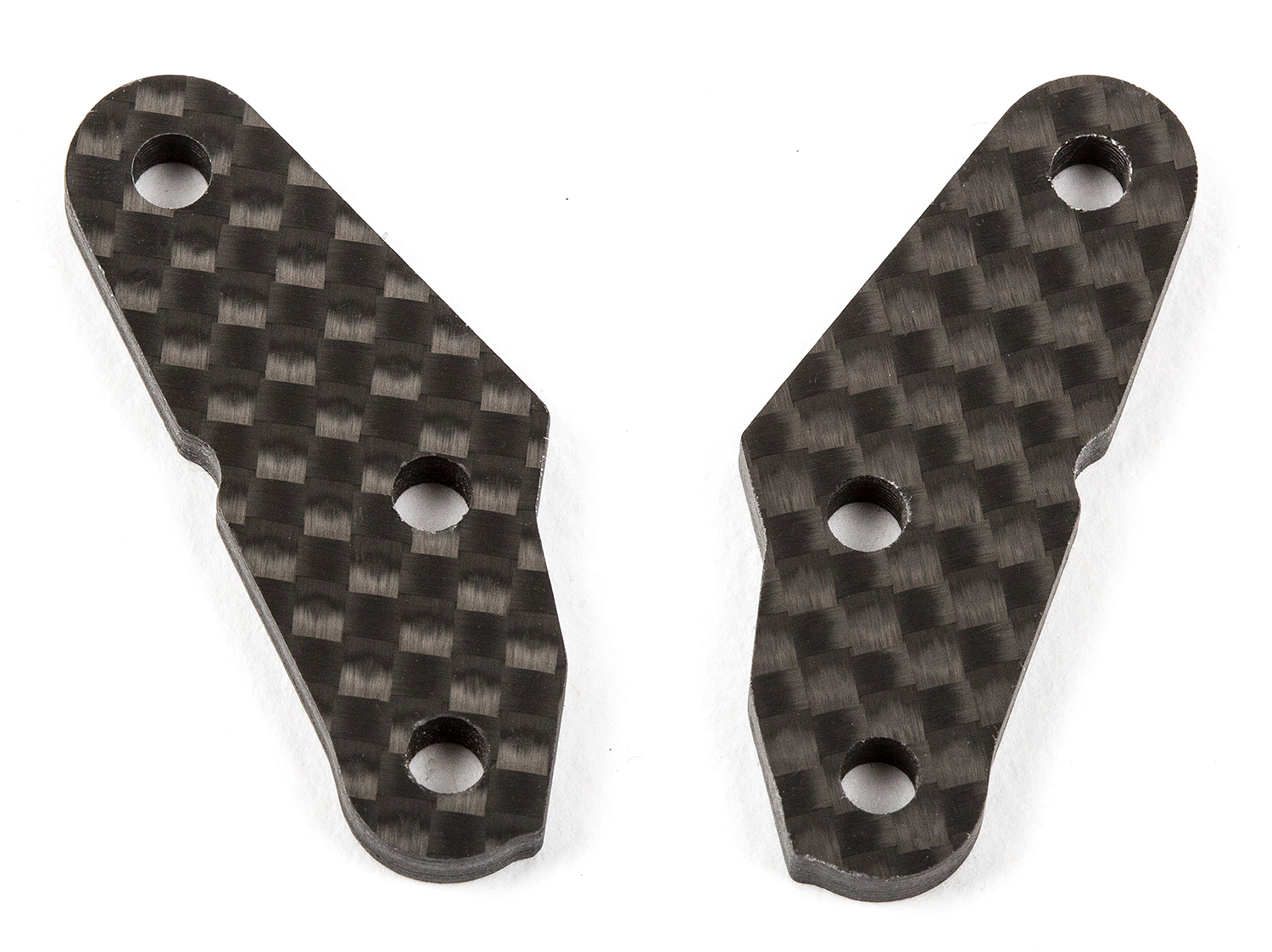New +2 woven-carbon fiber steering block arms for the RC8B3 and B3e! These new arms increase the steering Ackermann of the vehicle, resulting in a smoother steering feel when compared to the standard steering block arm set. Made from quality woven-carbon fiber for strength, slight weight savings, and a factory look.