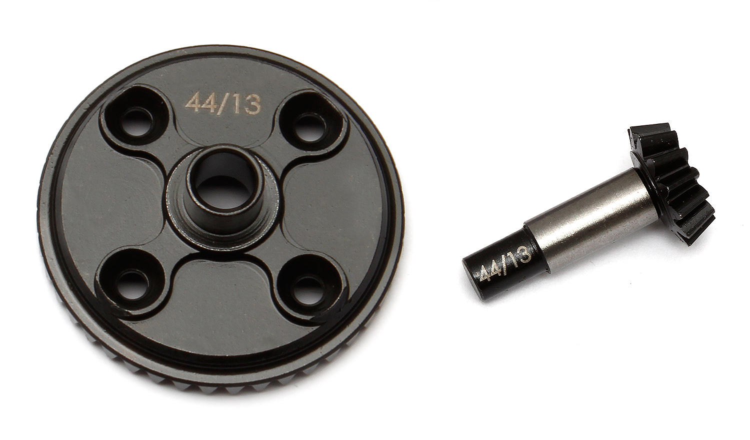 The RC8B3 44T ring gear and 13T pinion gear have returned as a combined packaged to include both gears as a set. Used as a tuning option in RC8B3 V3 differentials, the 44/13 gearing has a lower gear ratio for more top end speed over the 42/12 gear set.