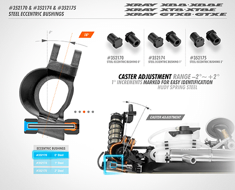 Eccentric bushing for I.A.C. (Integrated Adjustable Caster). 1° setting (identified by 1 dot) allows for either +1° or -1° caster adjustment depending on the orientation of the bushing. Made from famous Hudy Spring Steel™. Set of 2.