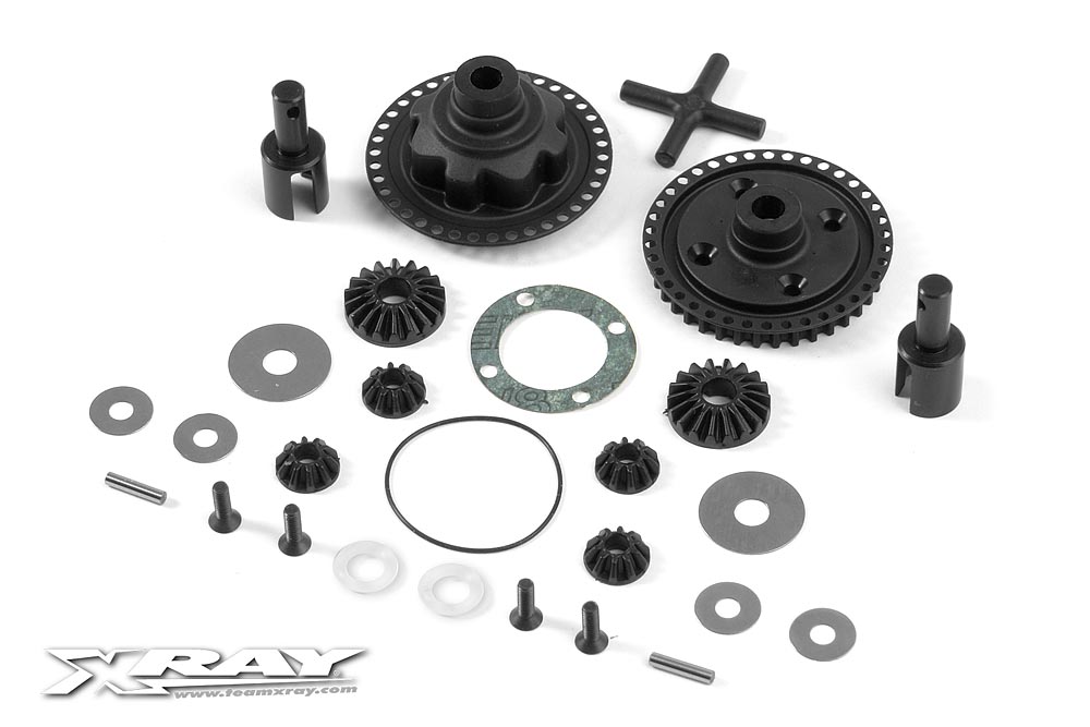 Complete gear differential set for XRAY T3 includes composite differential case and cover with pulley. Differential gears are made from tough composite material, precision-molded composite gears combined with light aluminum hardcoated outdrives, which create a lighter and super-smooth gear differential. This differential is NOT factory pre-assembled.