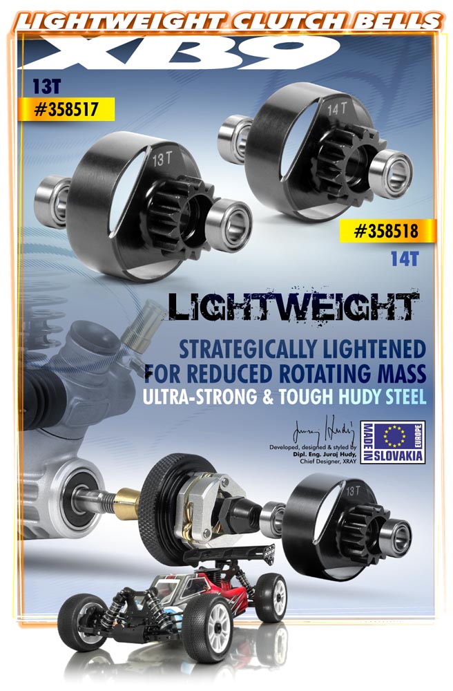 The clutchbell features unique oversized ball-bearings designed and engineered by XRAY. Replacing the standard 5x10 bearings with 1.3mm balls, the oversized clutch bearings are 5x12 with 2.0mm balls and extra-thick bearing walls. This translates to higher load-carrying capabilities which will increase the life of the bearings and reduce the risk of clutch bearing failure during long final runs. The bearings come with special high-temperature resistant grease to ensure proper lubrication during high-revving engine operations and long runs.