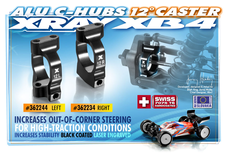 Aluminum LEFT C-hub with pre-set 12° is CNC-machined from premium Swiss 7075 T6 aluminum. Additionally black coated and laser engraved. Use with matching #362234 Alu C-hub 12° Right. Designed & recommended for use in high-traction conditions. Increases steering out of the corner, and makes the car more stable going into corners. Roll center position can be easily and quickly adjusted by inserting different thickness of shims on the top of the caster block between the block and the vertical ball stud. The caster blocks feature large openings for quicker & easier assembly/disassembly of the CVDs. The entire CVD assembly can be easily inserted/removed through the C-hub without the need for disassembly. The large openings also prevent collision of the CVD with the C-hub in serious crashes.