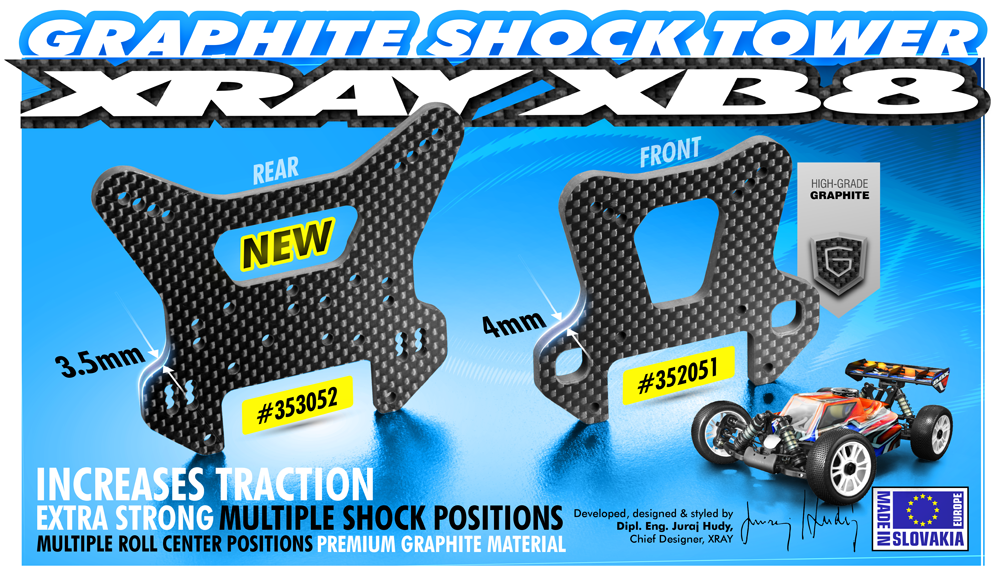 Rear shock tower CNC-machined from thick 3.5mm premium-grade graphite for light weight and superior strength. Includes multiple shock positions and multiple roll center adjustment positions. Provides more traction, recommended for low-traction tracks.